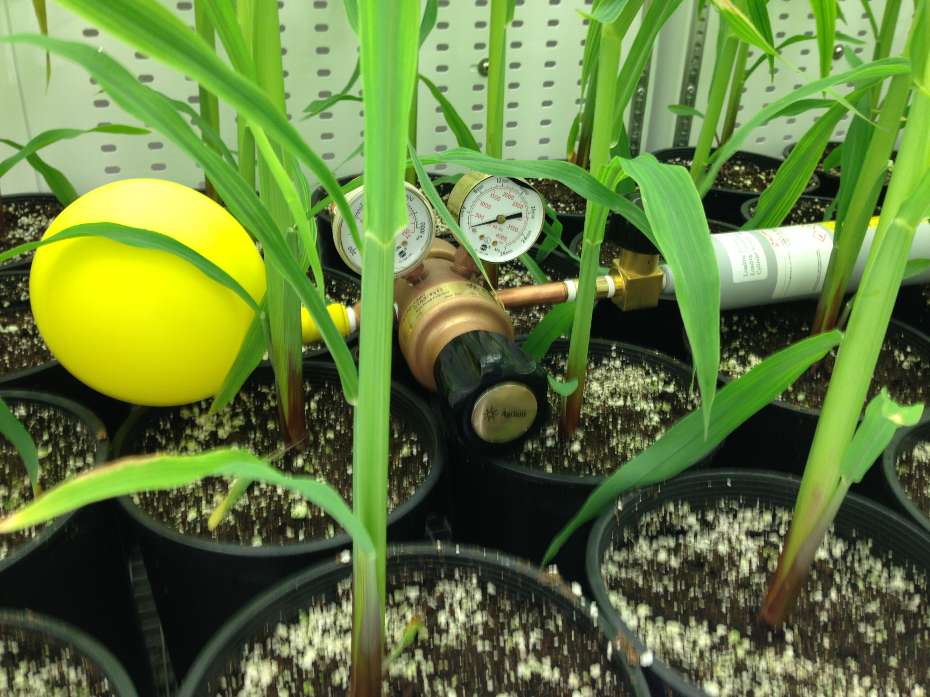 I’m so excited: I just performed my very first ever 13C isotopic pulse-label! We are growing labelled biomass in the CO2-regulated growth chambers for my upcoming field trial, and the corn plants have reached the stage where they will be growing quickly, so it was time. We rigged up a regulator to the tiny 13CO2 cylinder, and attached a latex balloon to the end. By filling the balloon with a small amount of CO2, it will slowly diffuse through the latex into the chamber, delivering a more uniform pulse. We’ll be labelling over the next few weeks as the corn plants shoot up.