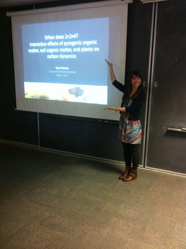 I realized it was one of the first times I’d given a really “big picture” seminar, where I tell the whole arc of a story, rather than focusing in on a specific study and its methods in detail. I guess my MS seminar was similar in some ways, but this felt different, I think because all the experiments from my Ph.D. research are more directly connected, leading from one to the next, while my MS really had three very different takes on the C impact of biochar production (incubation, modelling, and policy). It was fun tying everything together, and trying to make a compelling story. I started with the issue of priming, and discussed my incubation study where I try to isolate and identify the mechanisms responsible, from there, expanded to the impact of plants with my greenhouse study, drilled down into how to partition three C sources using stable C isotopes in my field trial, and then checked out what was happening with the microbes. It was really fun, and I appreciated the great questions, ranging from methodology to statistical analyses to big-picture implications. Now, I just have to finish my dissertation and defend!!!